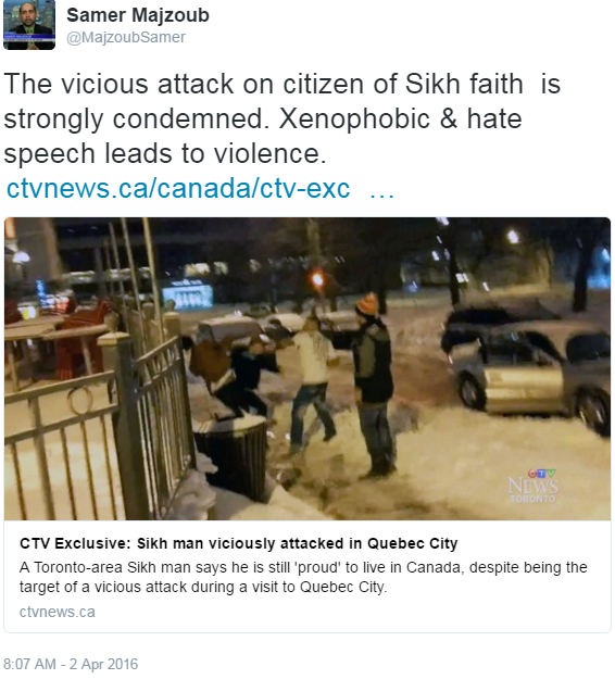 Comment:on the vicious attack against citizen of Sikh faith in Quebec city.Stop hate speech.